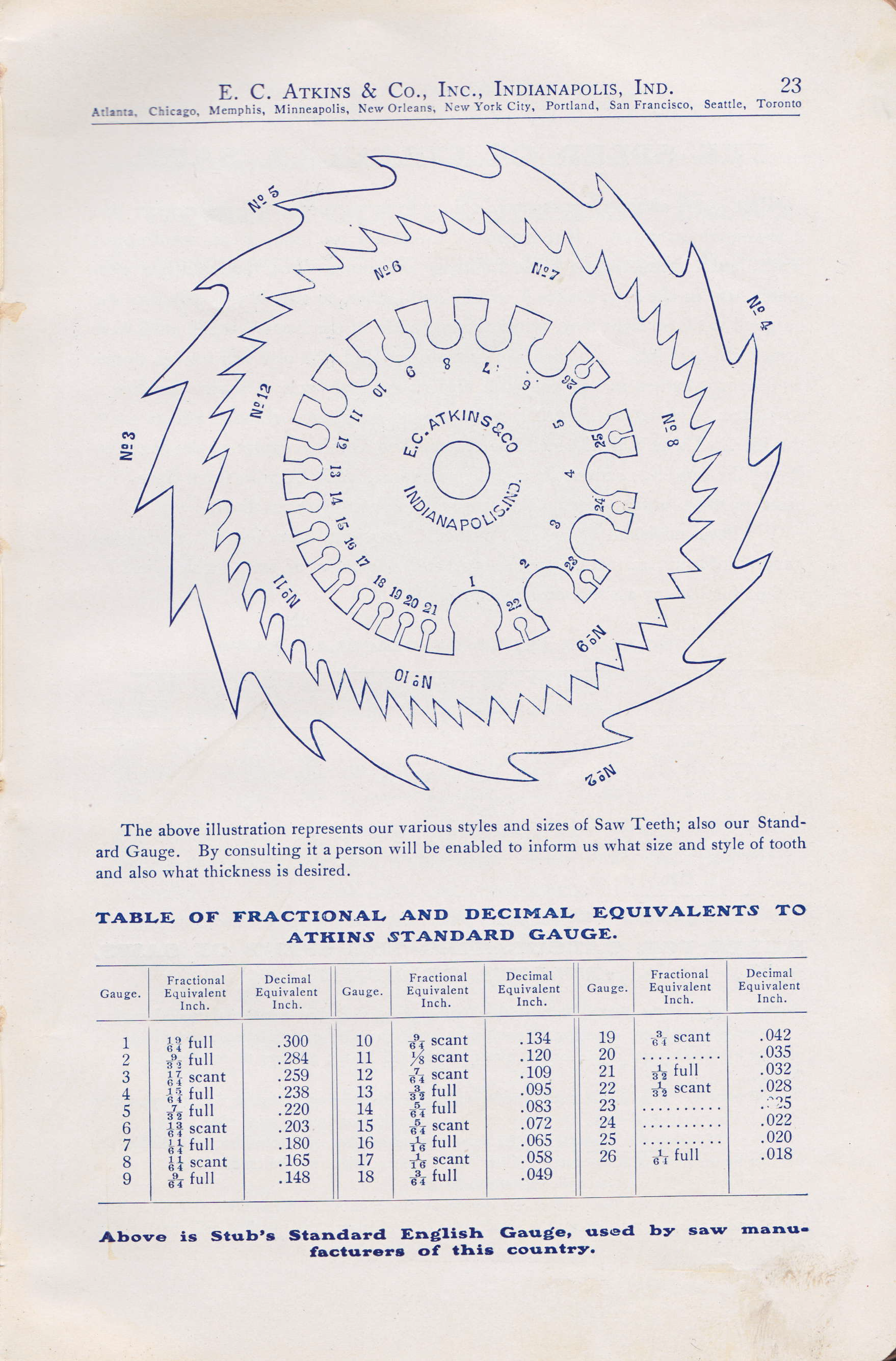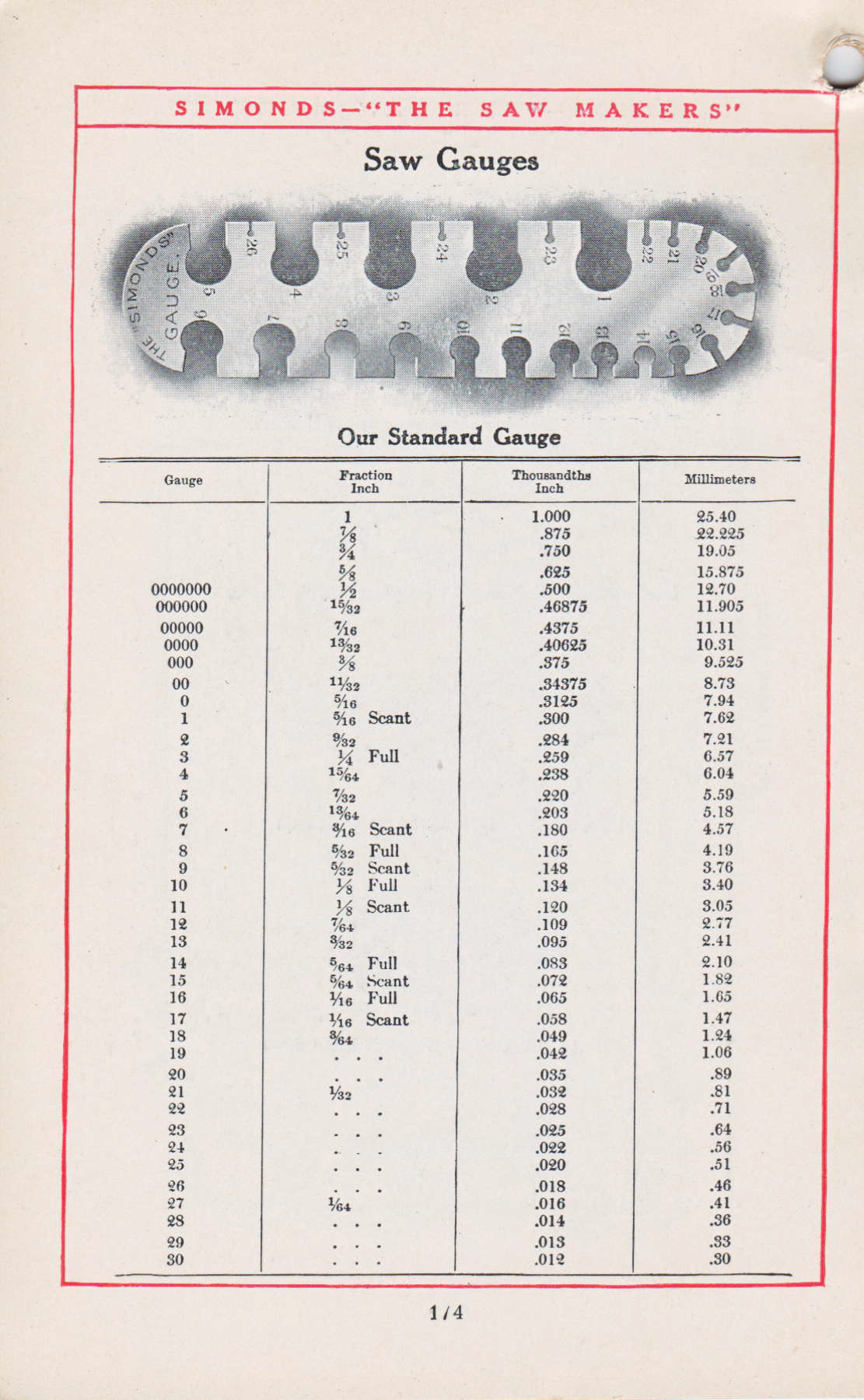 - Keen Kutter, Keen Kutter Catalog No 776 this gauge information is in a small table in the lower left hand side of the catalog page. Unfortunately the copy that I have is not overly clearly reproduced.