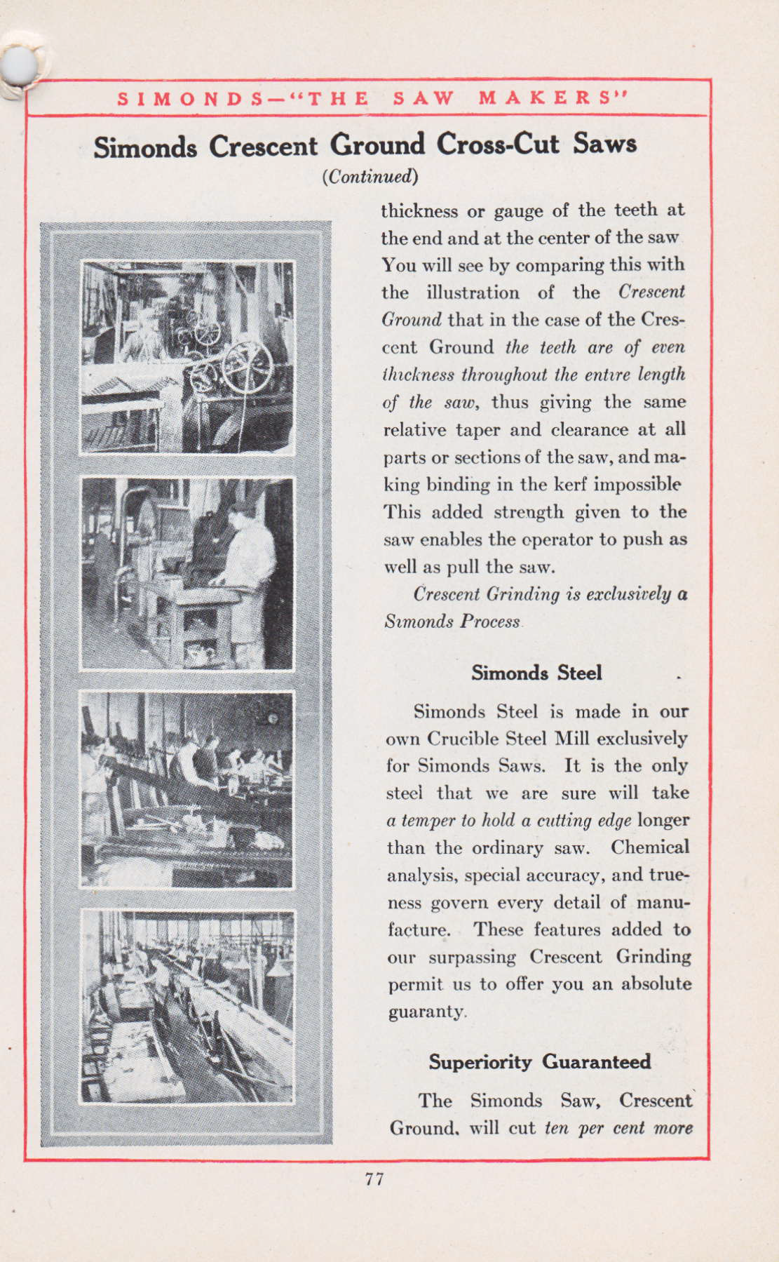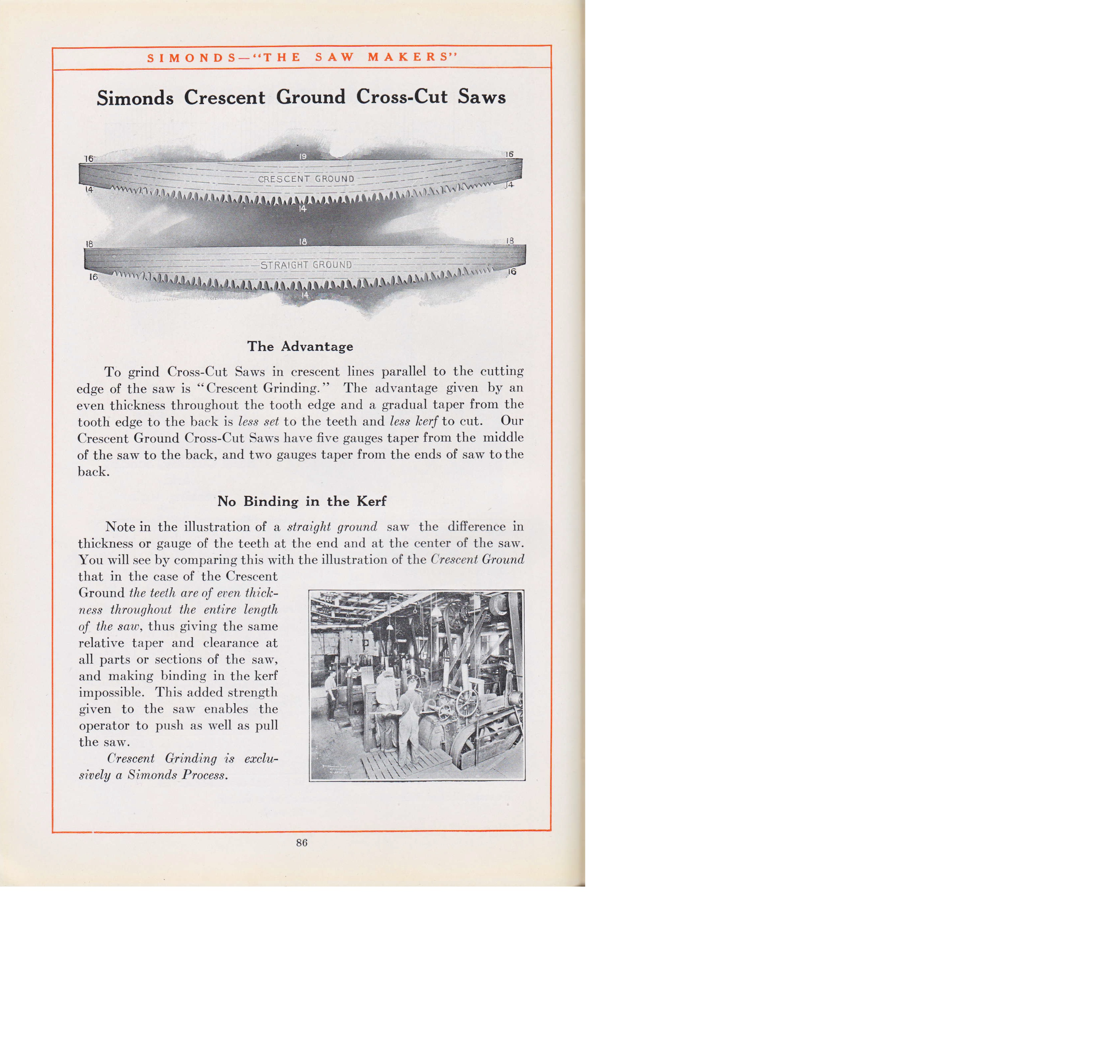 - Simonds Grinds Part 1,, Simonds Crescent Ground Cross-Cut Saws, The Advantage. From Simonds Catalog 23, 1923.