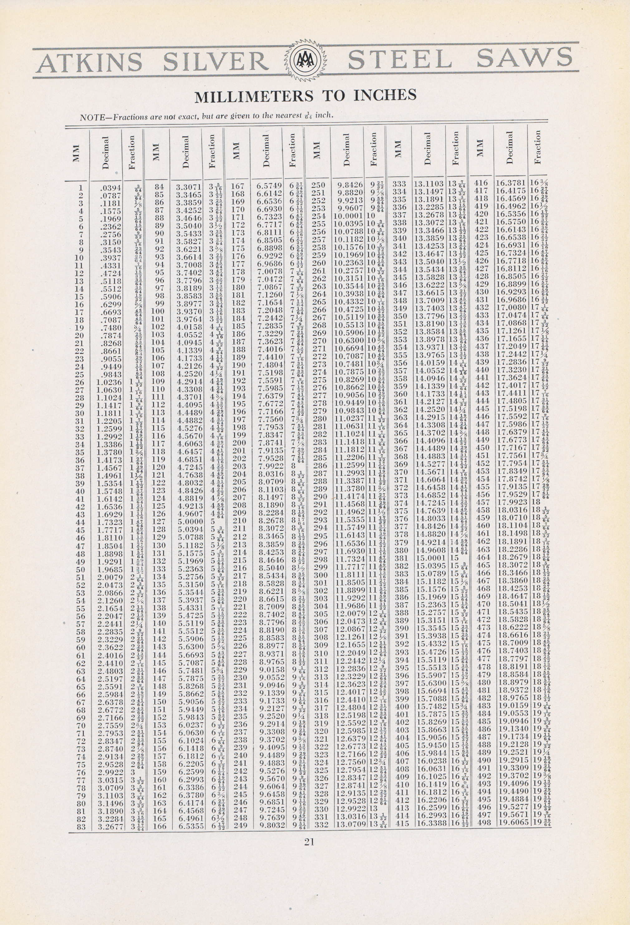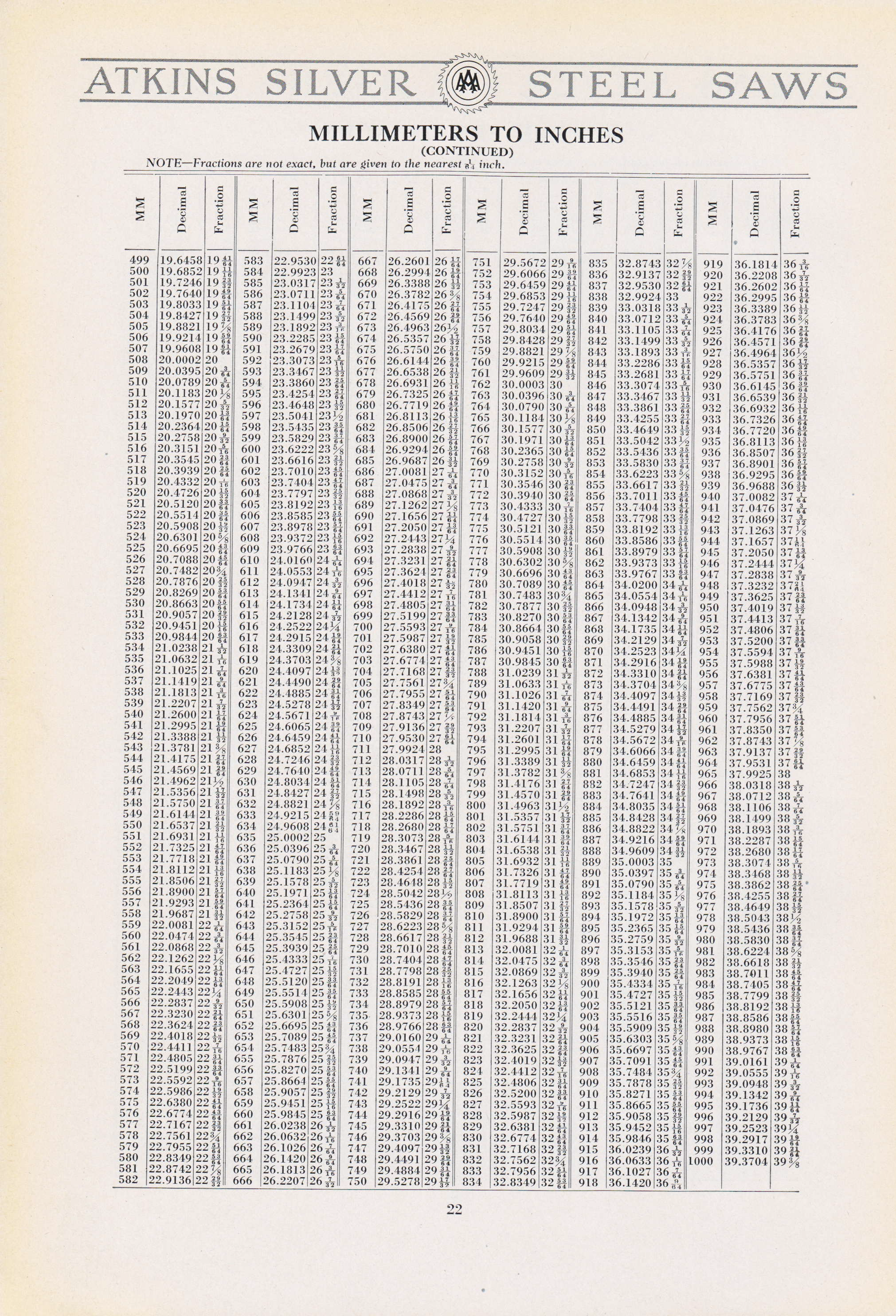 - MM to Inch from Atkins part 1, From Atkins Catalog 19 in 1923.