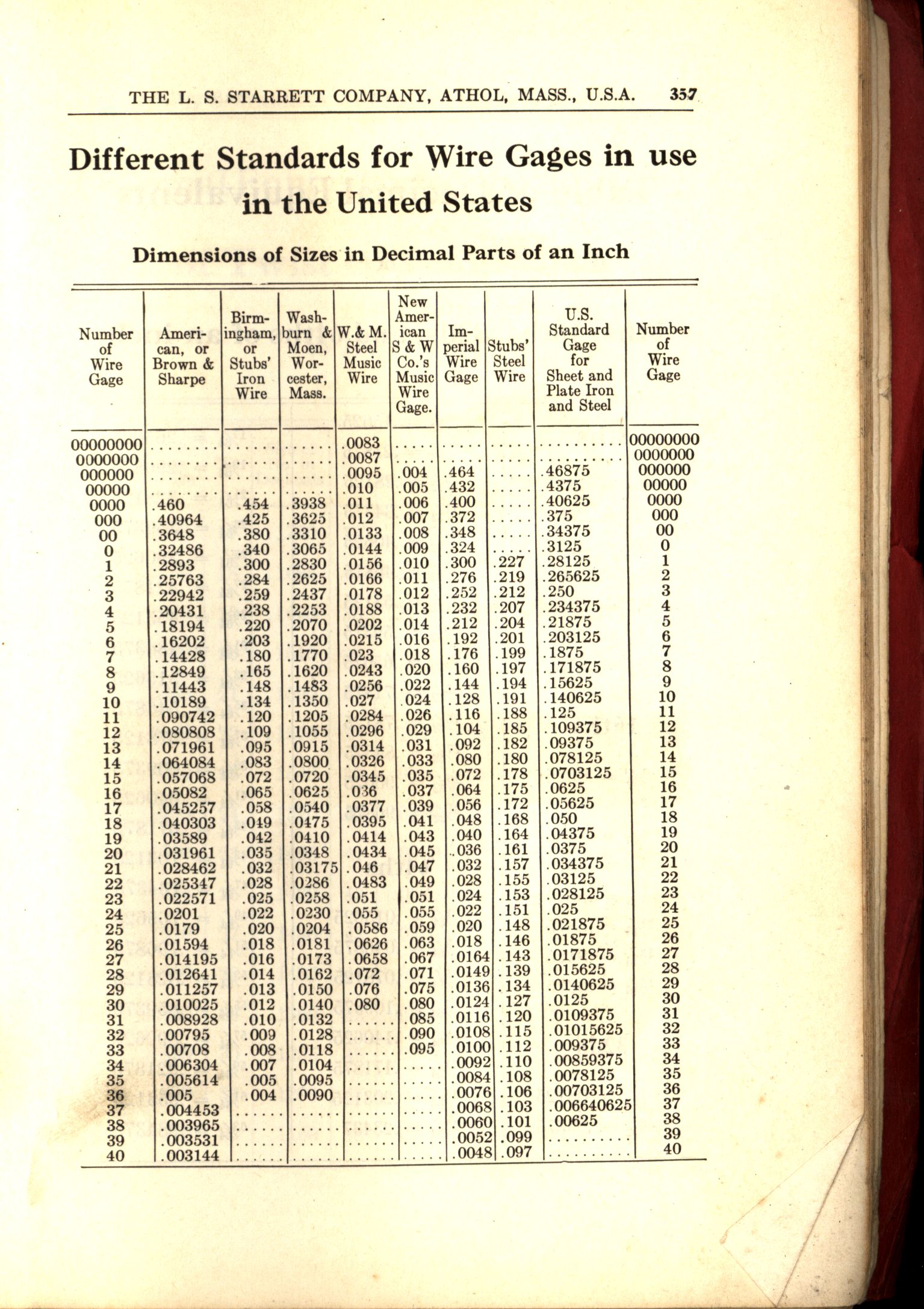 - Different Standards, Different Standards for Wire Gages in use in the United States. From L.S.Starrett catalog no 25, 1935