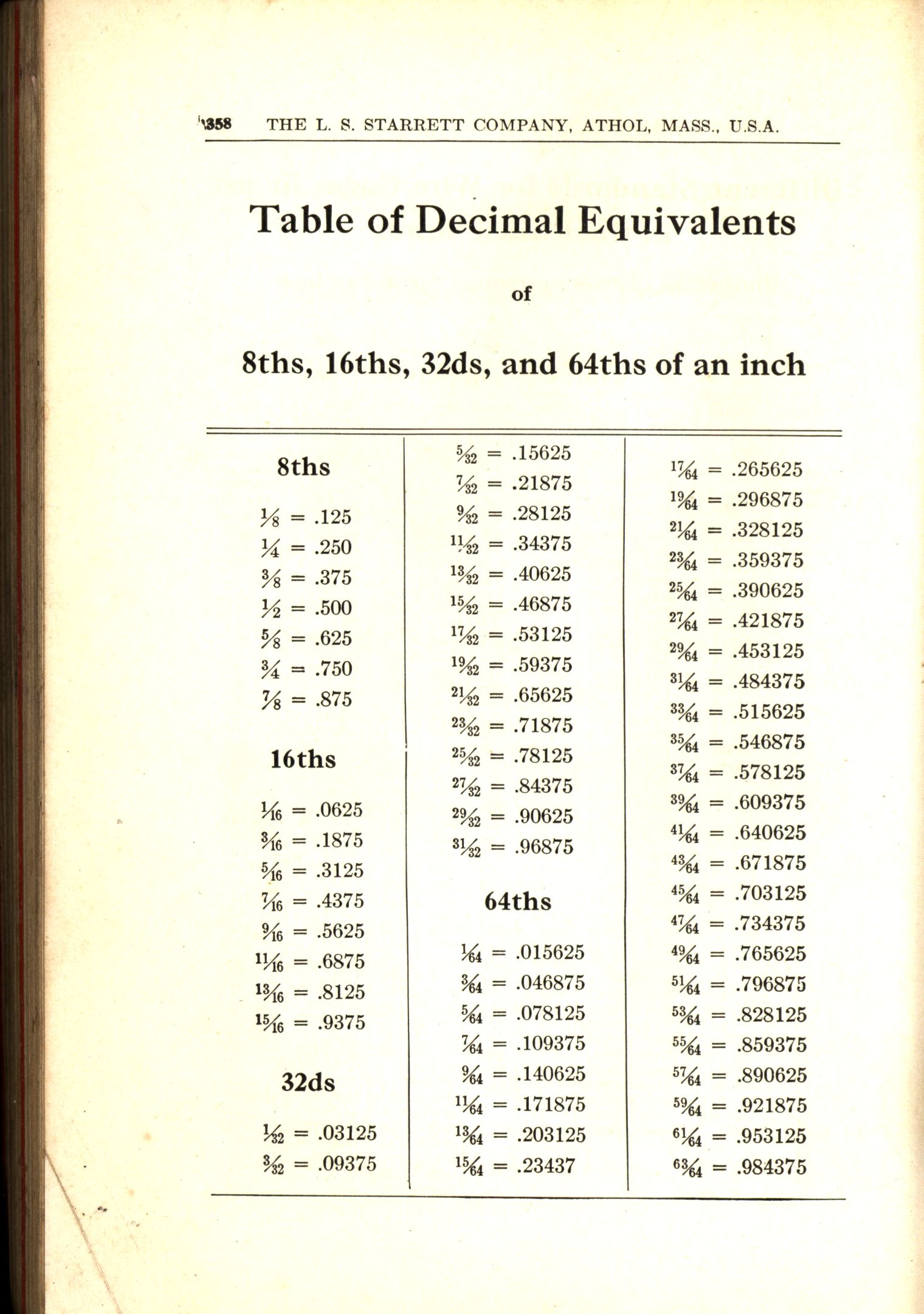- Table of Decimal Equivalents, 8th, 16ths, 32ds and 64th of an inch. From L.S.Starrett catalog no 25, 1935