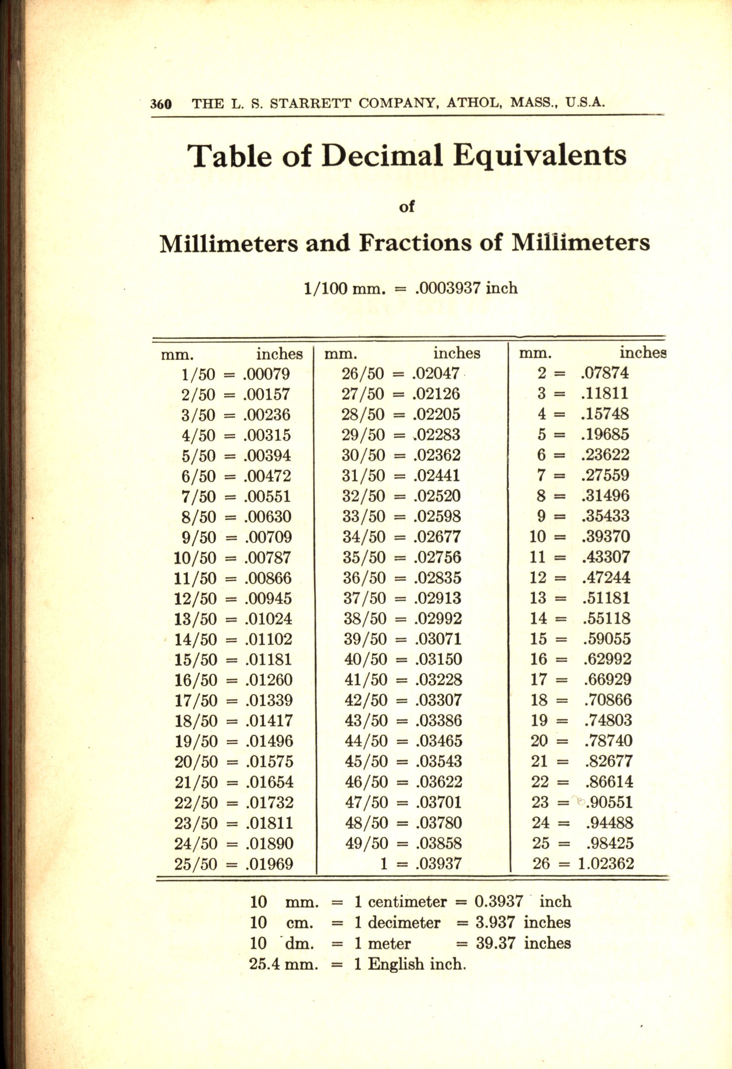 - Table of Decimal Equivalents, Millimeteres and Fractions of Millimeters to inches. From L.S.Starrett catalog no 25, 1935