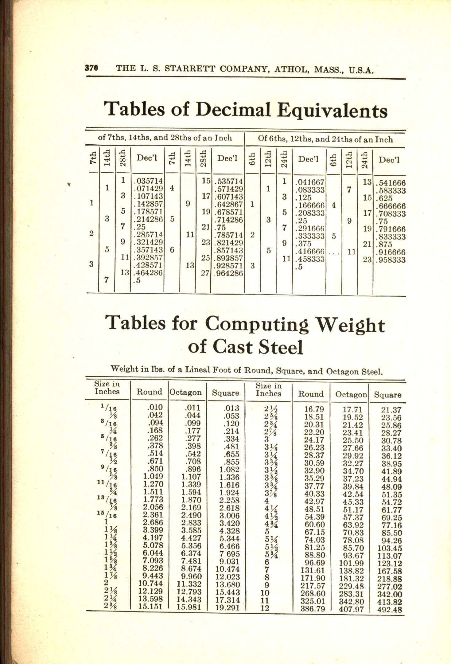 - Tables of Decimal Equivalents, 7ths, 14ths, 28ths and 6ths, 12ths, 24ths of an inch to decimal. From L.S.Starrett catalog no 25, 1935
