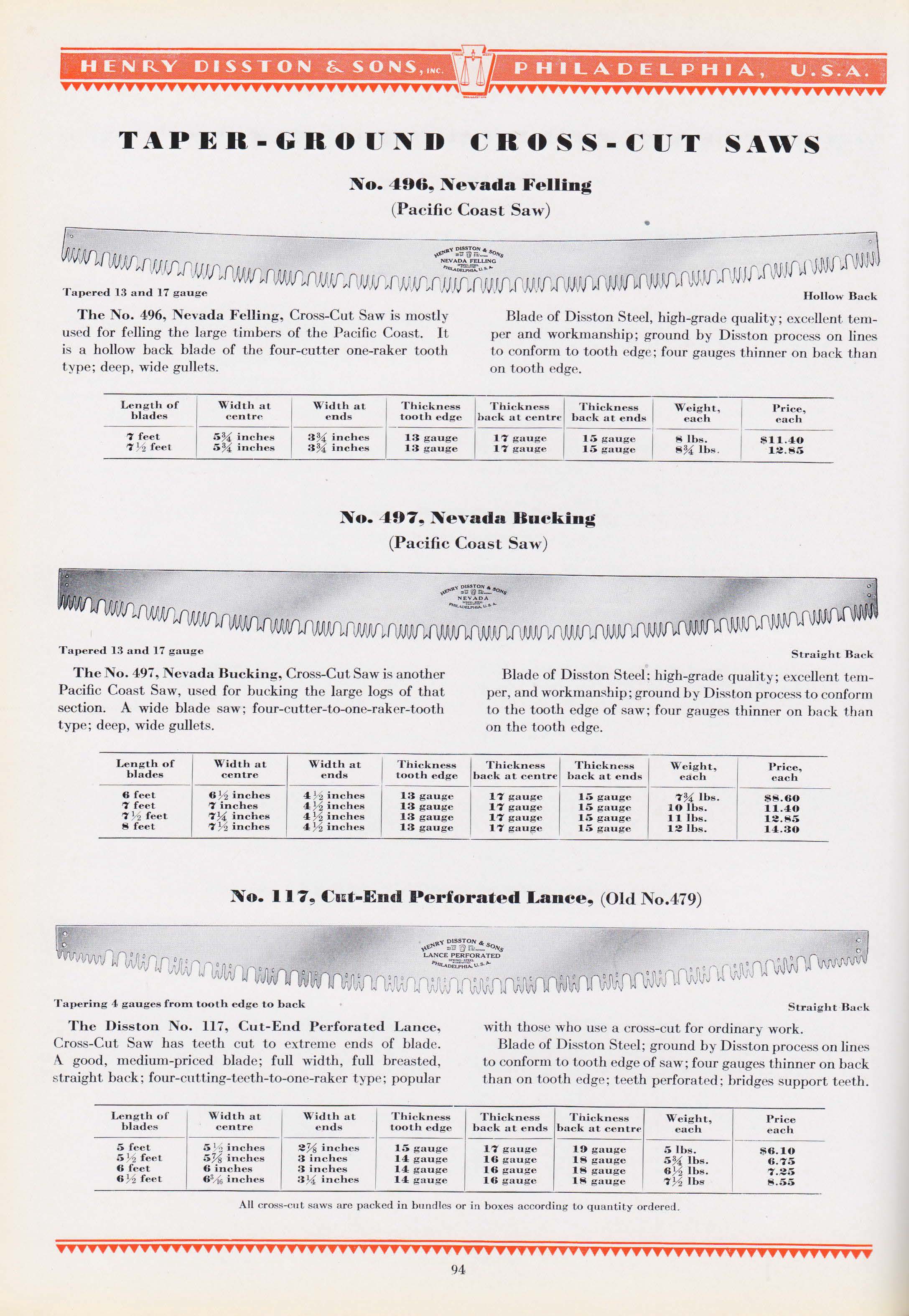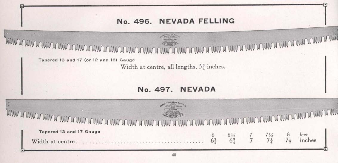 - Taper-Ground Cross-Cut Saws, 117, 496, 497, Nevada Felling, Nevada Bucking, Cut-End Perforated Lance (Old No 479)