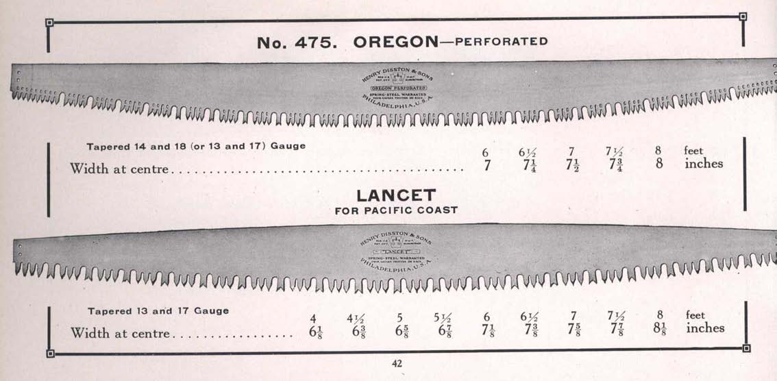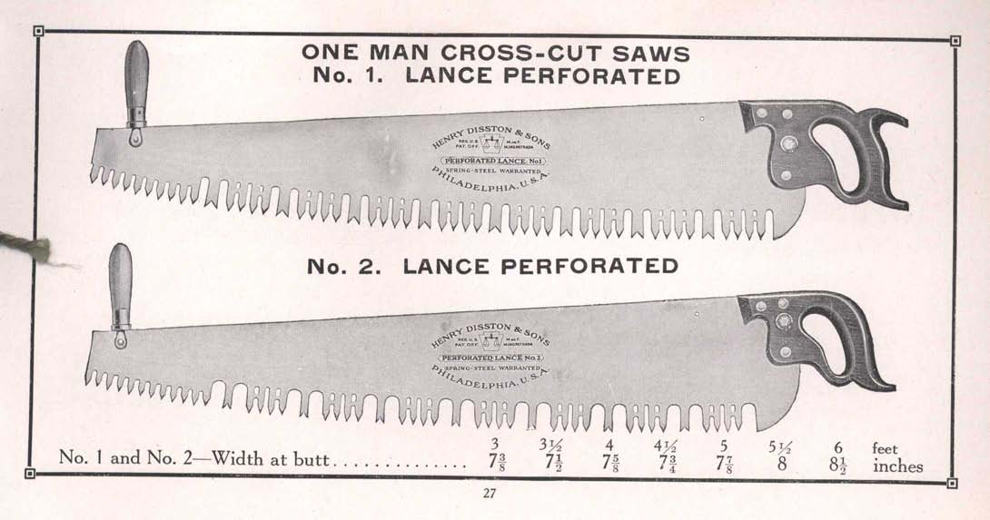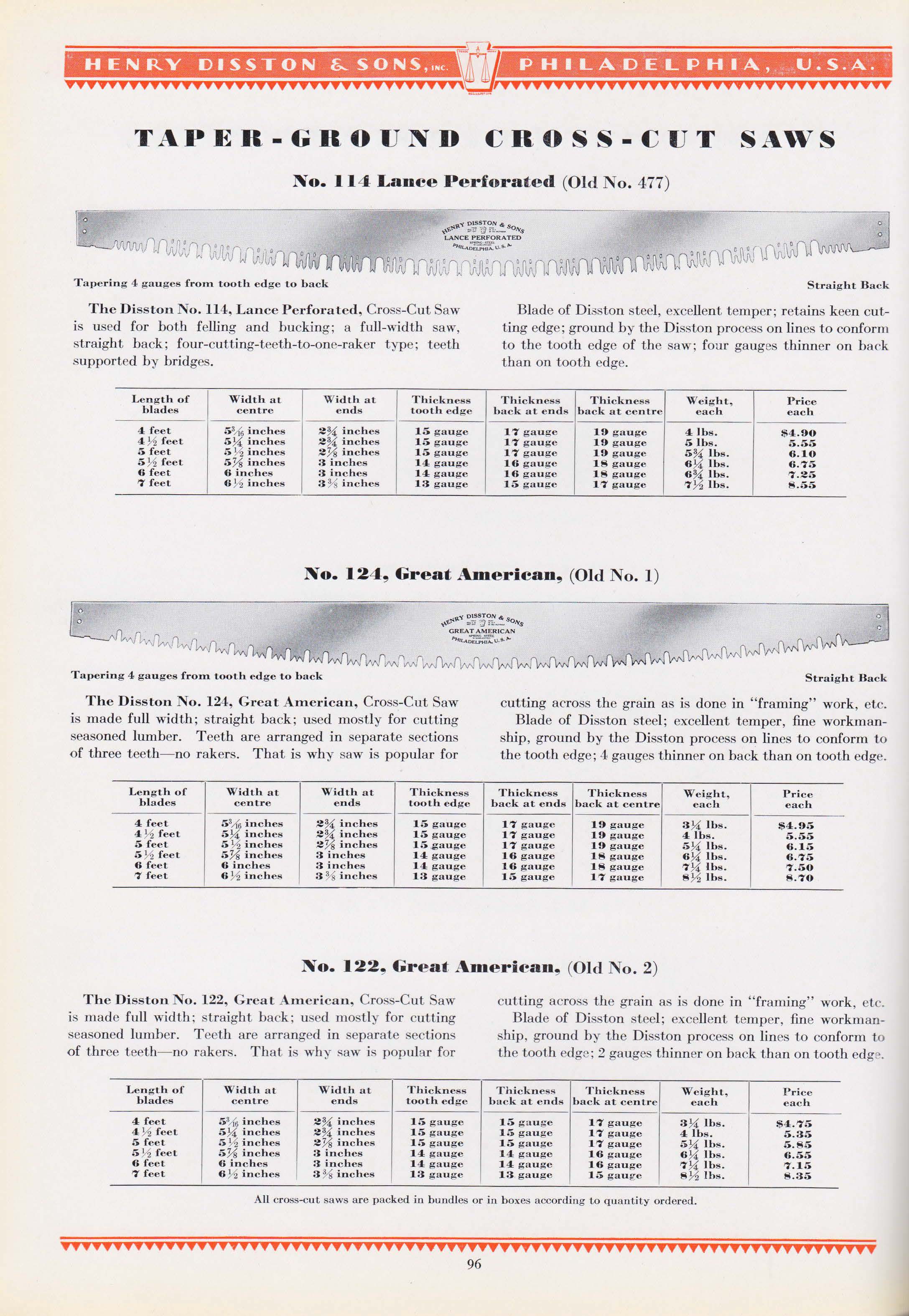 - Taper-Ground Cross-Cut Saws, 114, 124, 122, Lance Perforated (Old No 477)Great American (Old No 1, 2)