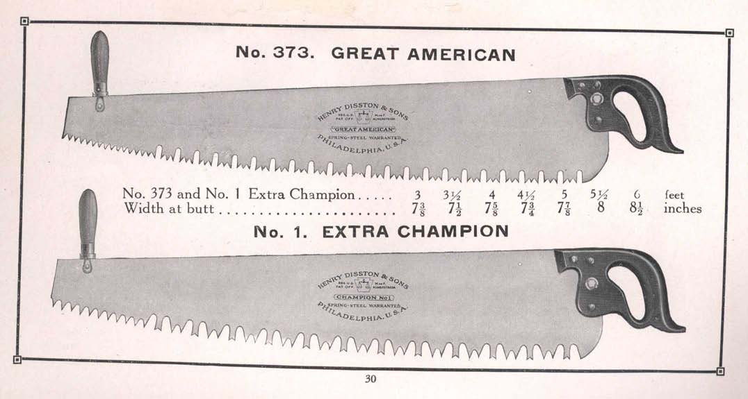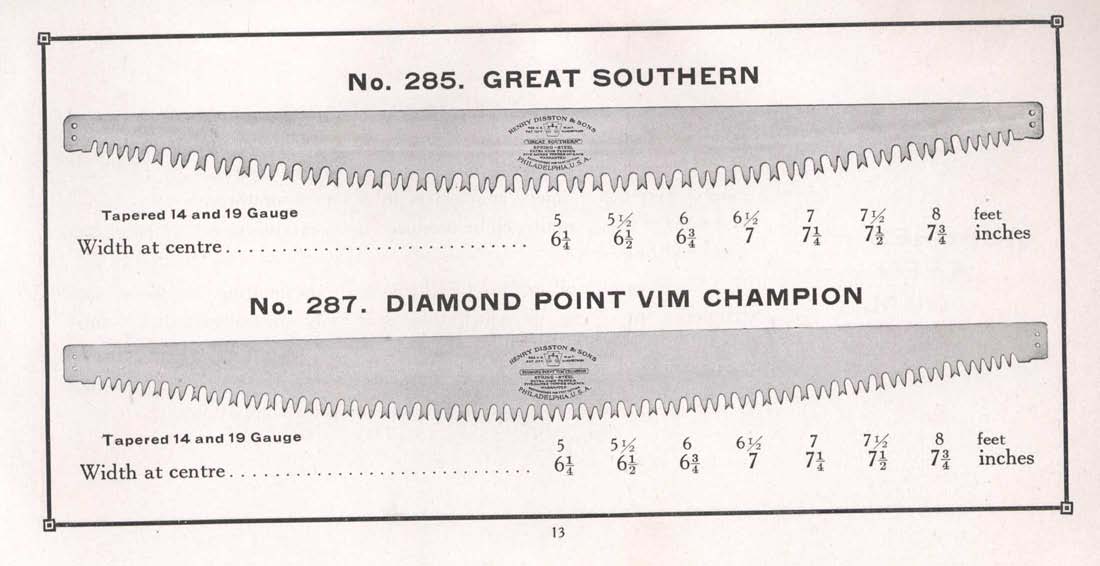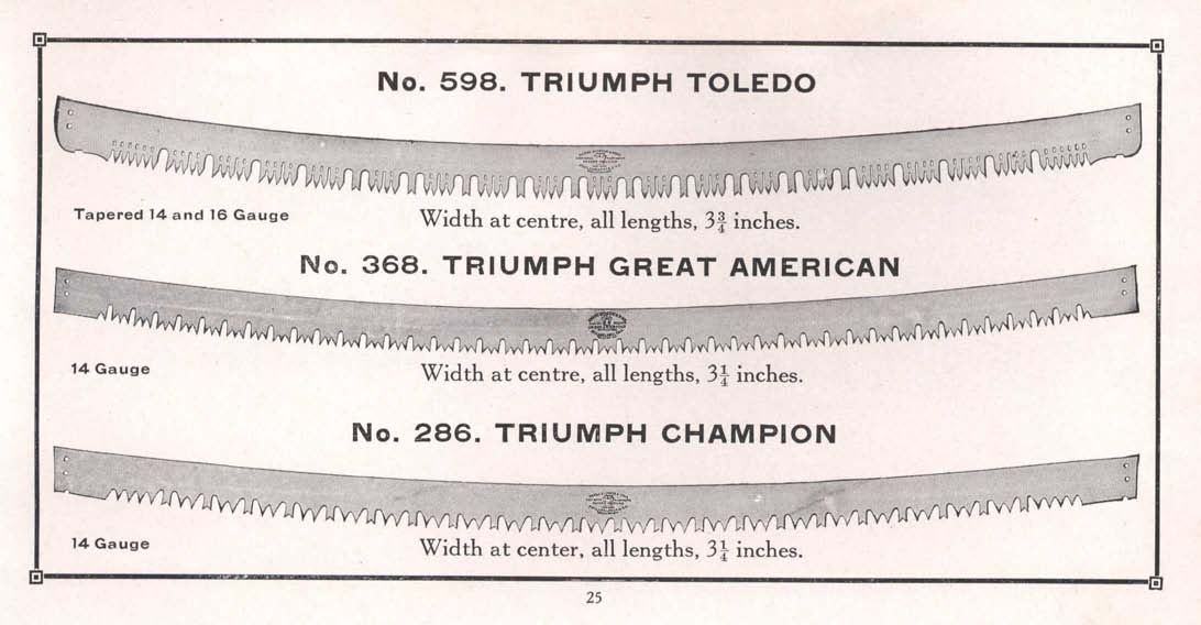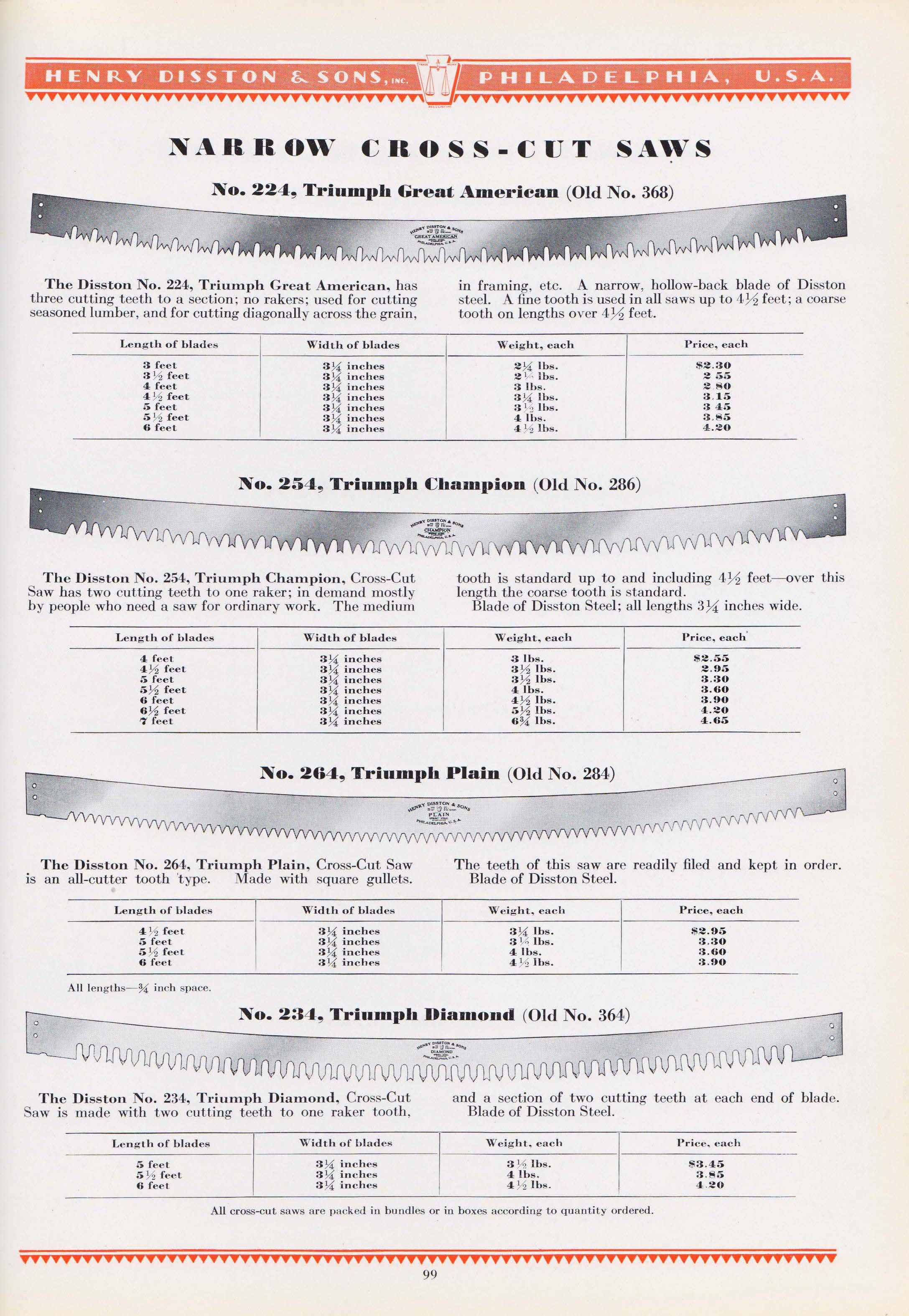 - Narrow Cross-Cut Saws, 224, 254, 264, 234, Triumph Great American (old No 368), Champion (Old No 286), Plain (Old No 284), Diamond (Old No 364)