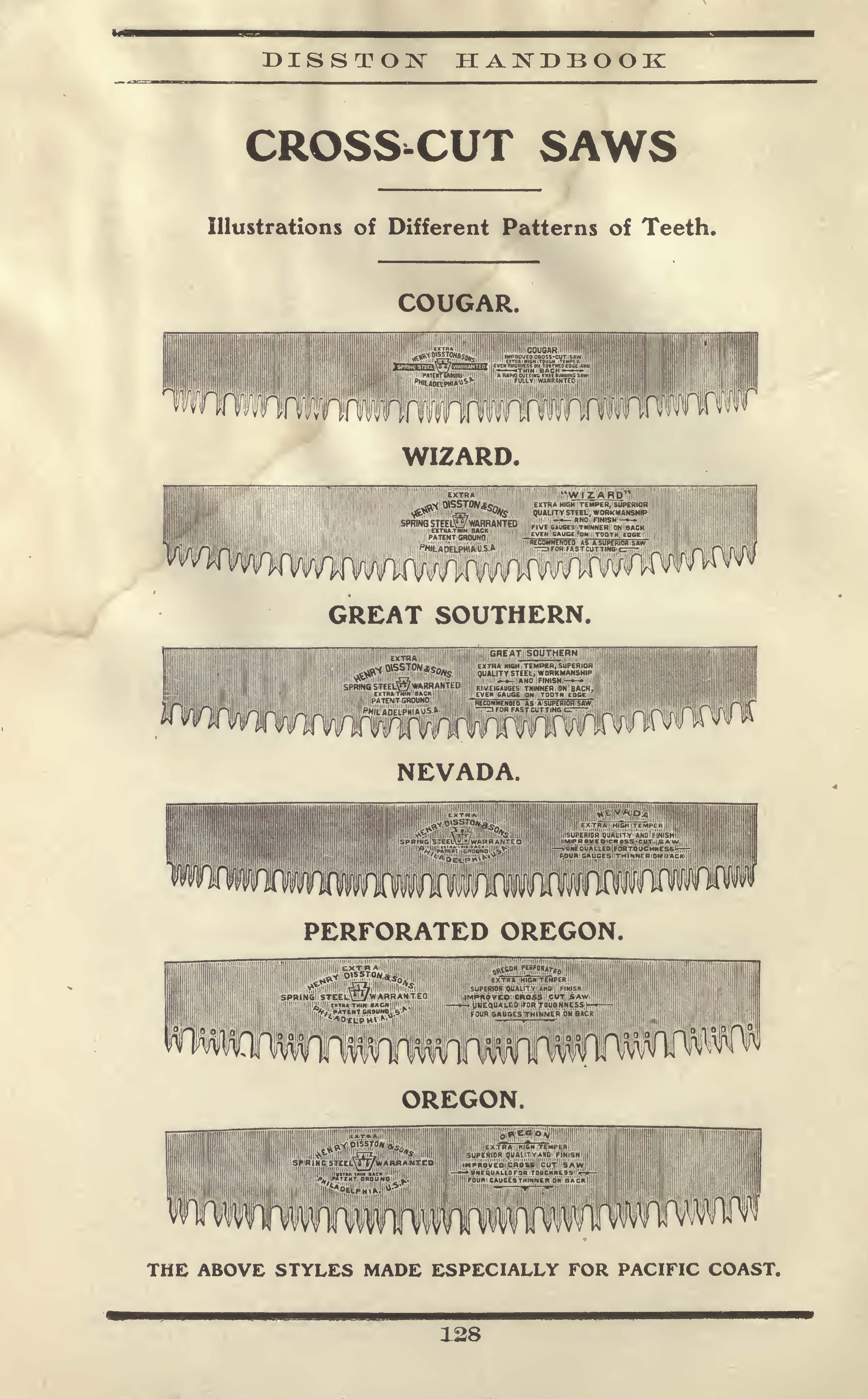 - Cross-Cut Saws, Different Patterns of Teeth, Cougar, Wizard, Great Southern, Nevada Perforated Oregon, Oregon