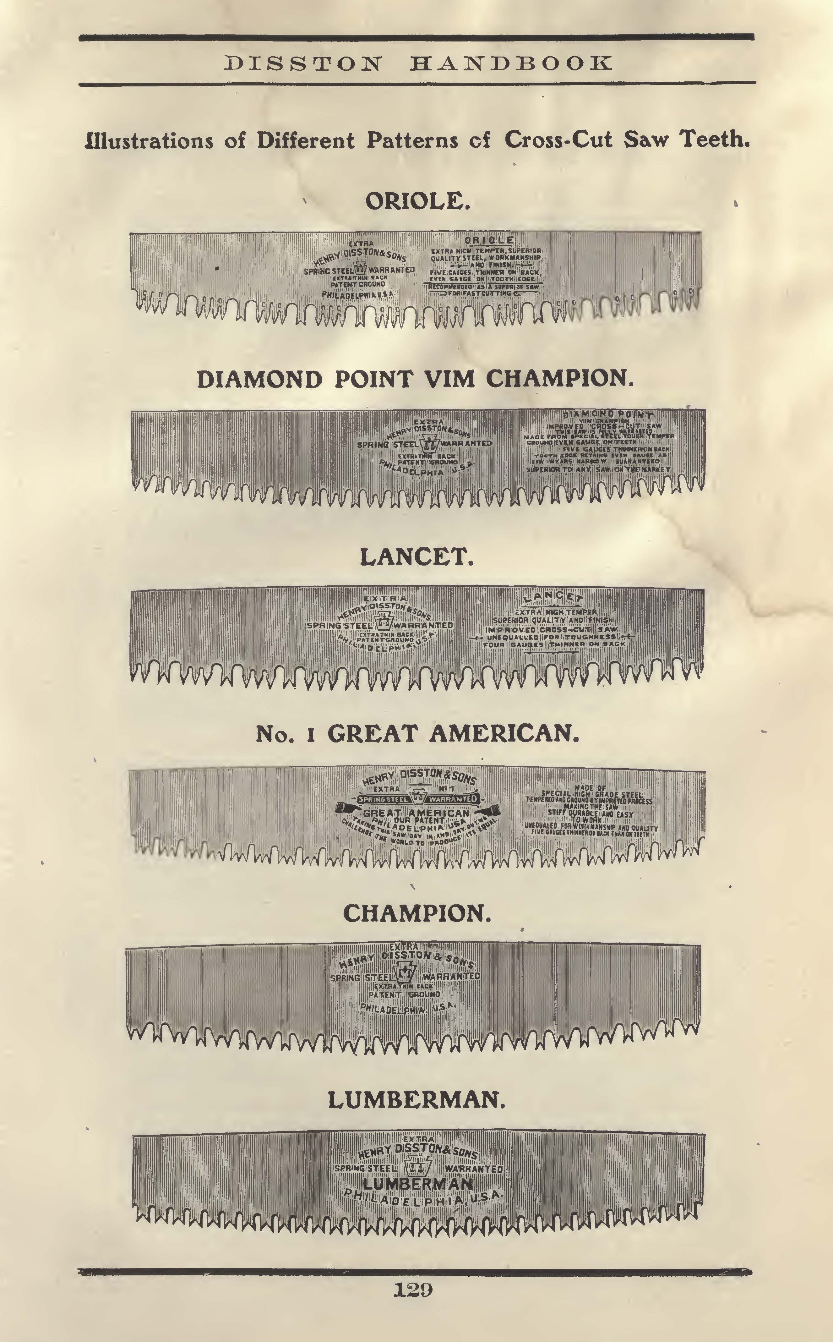 - Cross-Cut Saws, Different Patterns of Teeth continued, Oriole, Diamond Point Vim Champion, Lancet, No 1 Great American, Champion, Lumberman