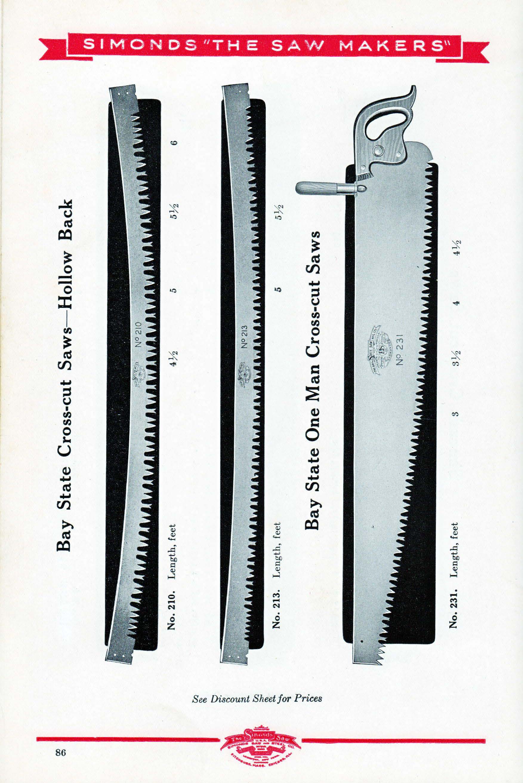 - Bay State Cross-cut Saws -- Hollow Back and One Man Cross-cut Saws, 210, 213, 231,