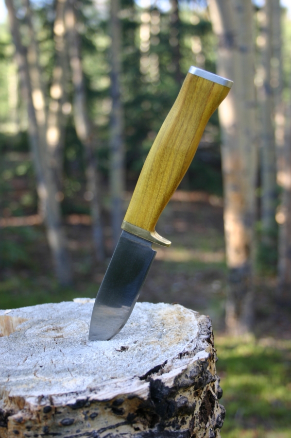 I have included pictures of the knife that I made and tested for the trip. It was designed based on years of hunting and camping and several prototypes. The 3 ½ inch blade is 1/8th inch thick O-1 tool steel differentially hardened at Rockwell 58, flat ground with a convex edge. A stick tang runs through the 5 inch shaped Osage Orange handle. The handle is large to give a secure and comfortable working grip. This design proved to be a strong and light knife useful for many camp and cooking chores, but simply cannot do the chopping work even a mini axe can do.