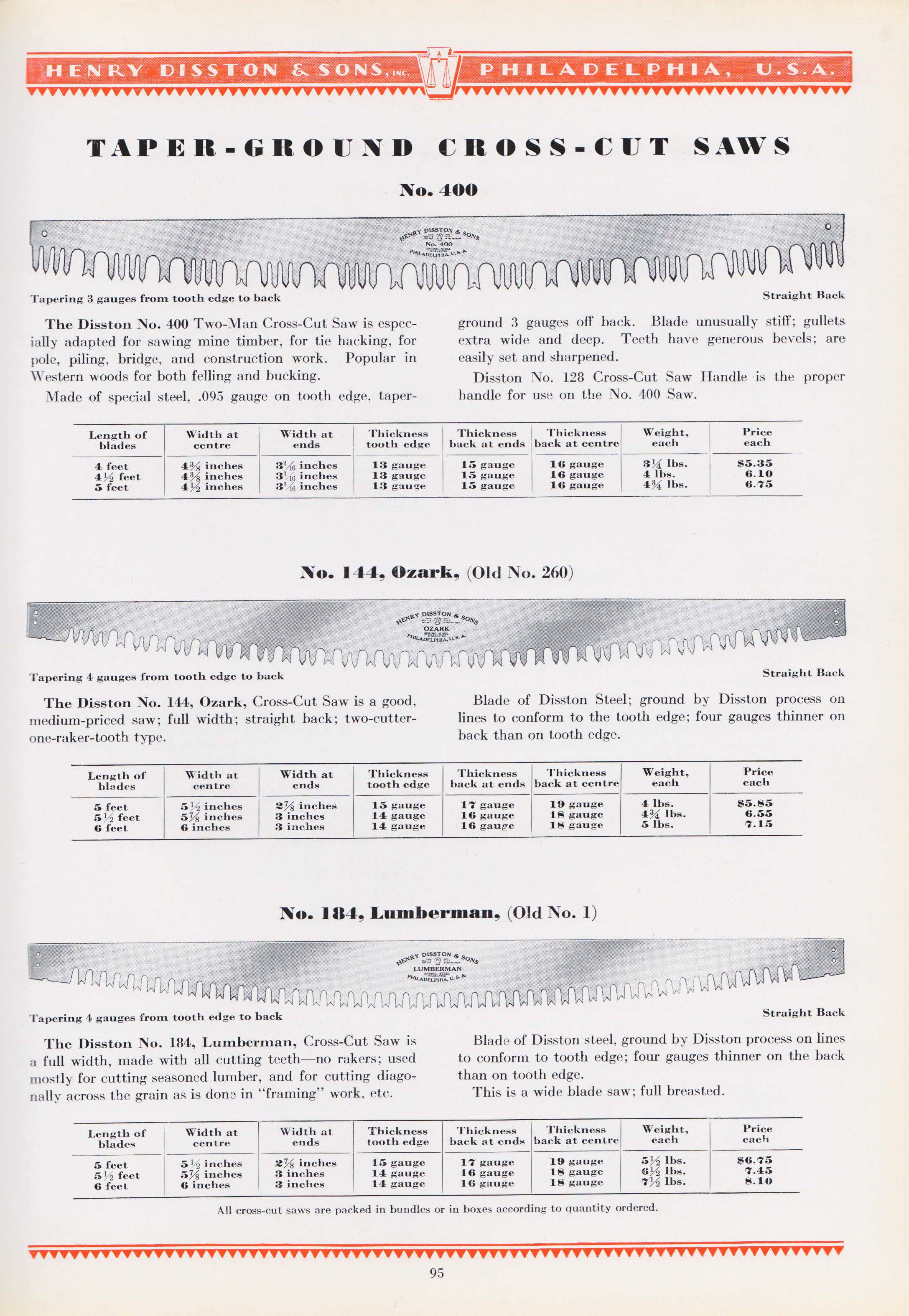 - Taper-Ground Cross-Cut Saws, 400, 144, 184, Ozark (Old No 260), Lumberman (Old No. 1)