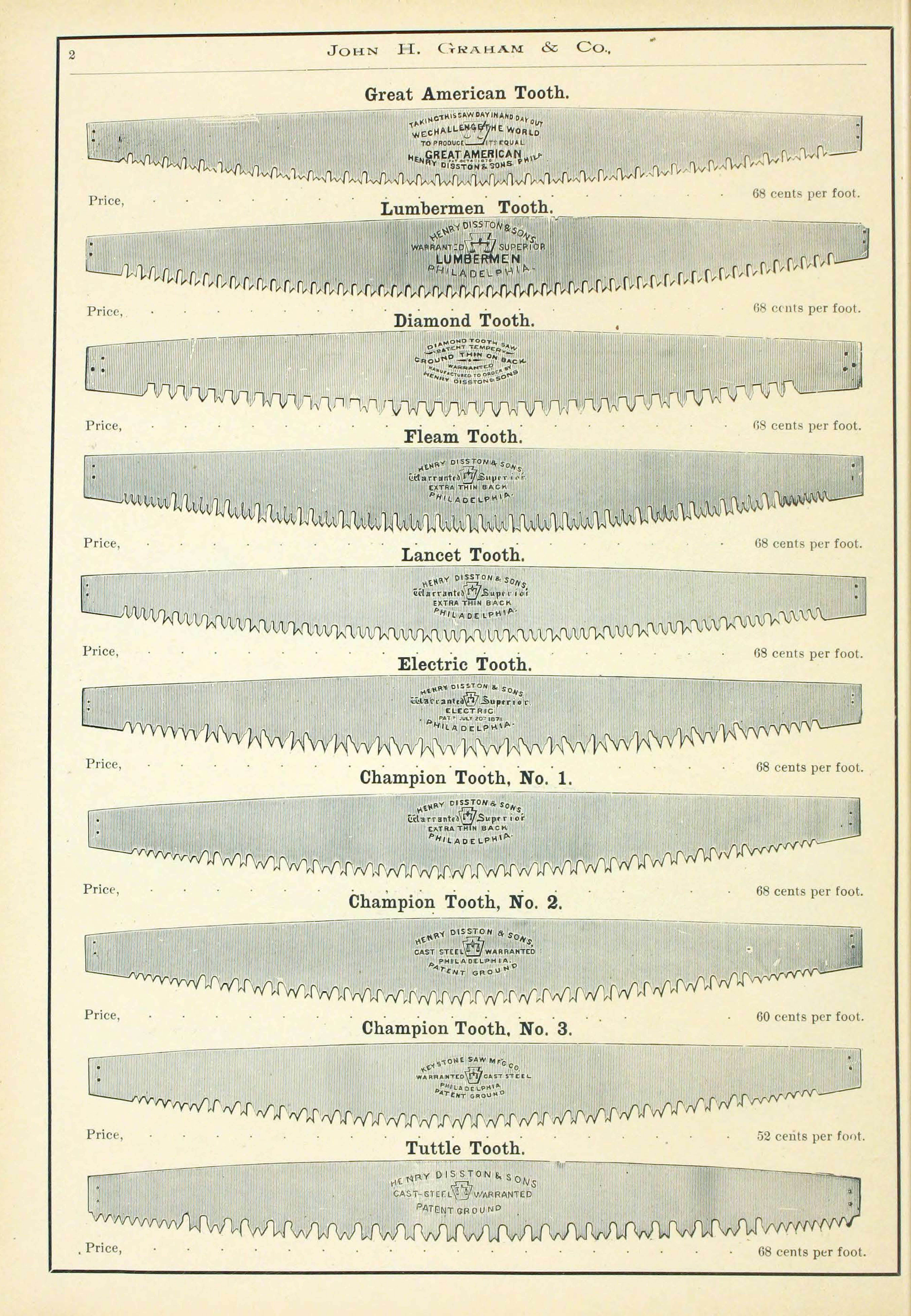 - Great American Tooth, Lumberman Tooth, Diamond Tooth, Fleam Tooth, Lancet Tooth, Electric Tooth, Champion Tooth No 1, No 2, No 3, Tuttle Tooth