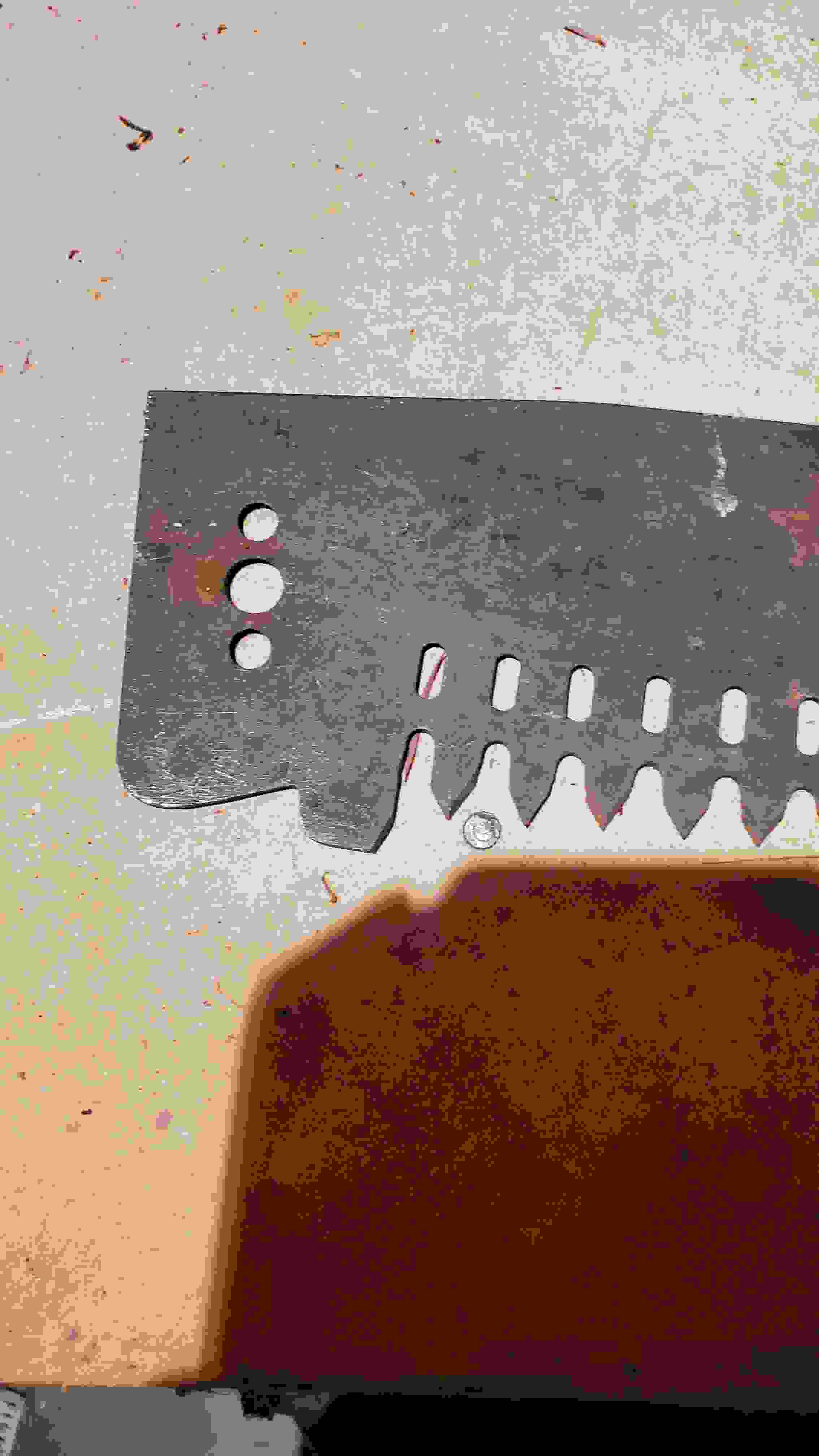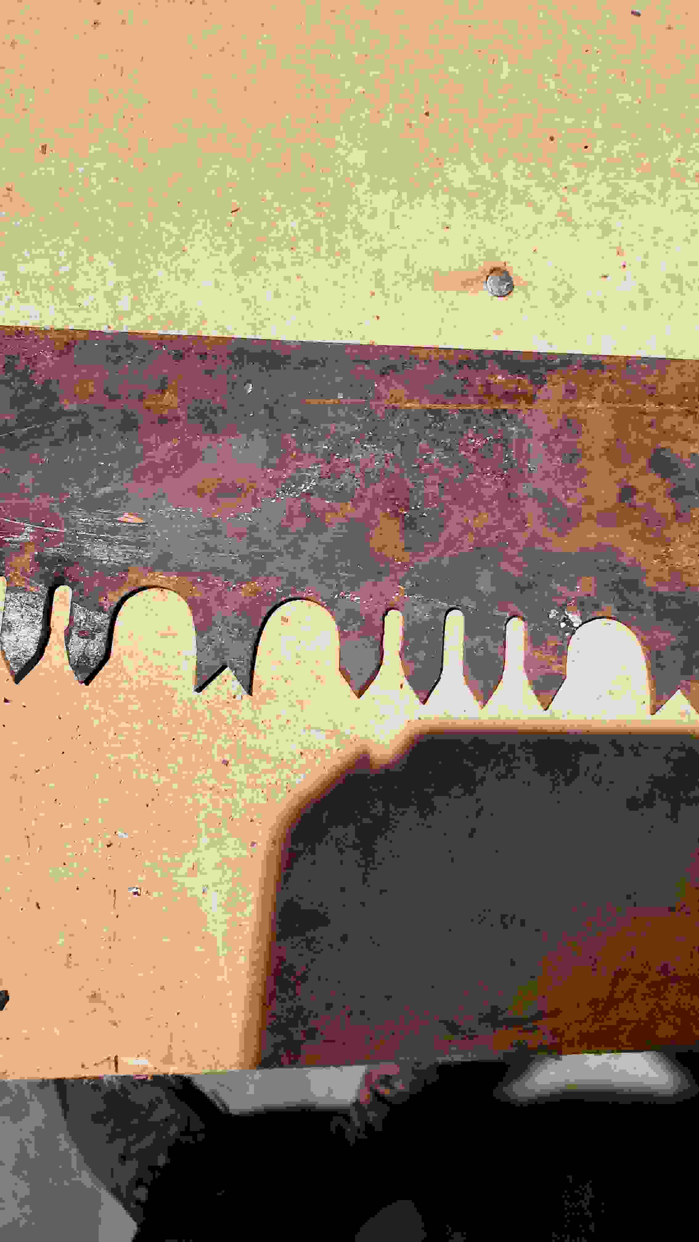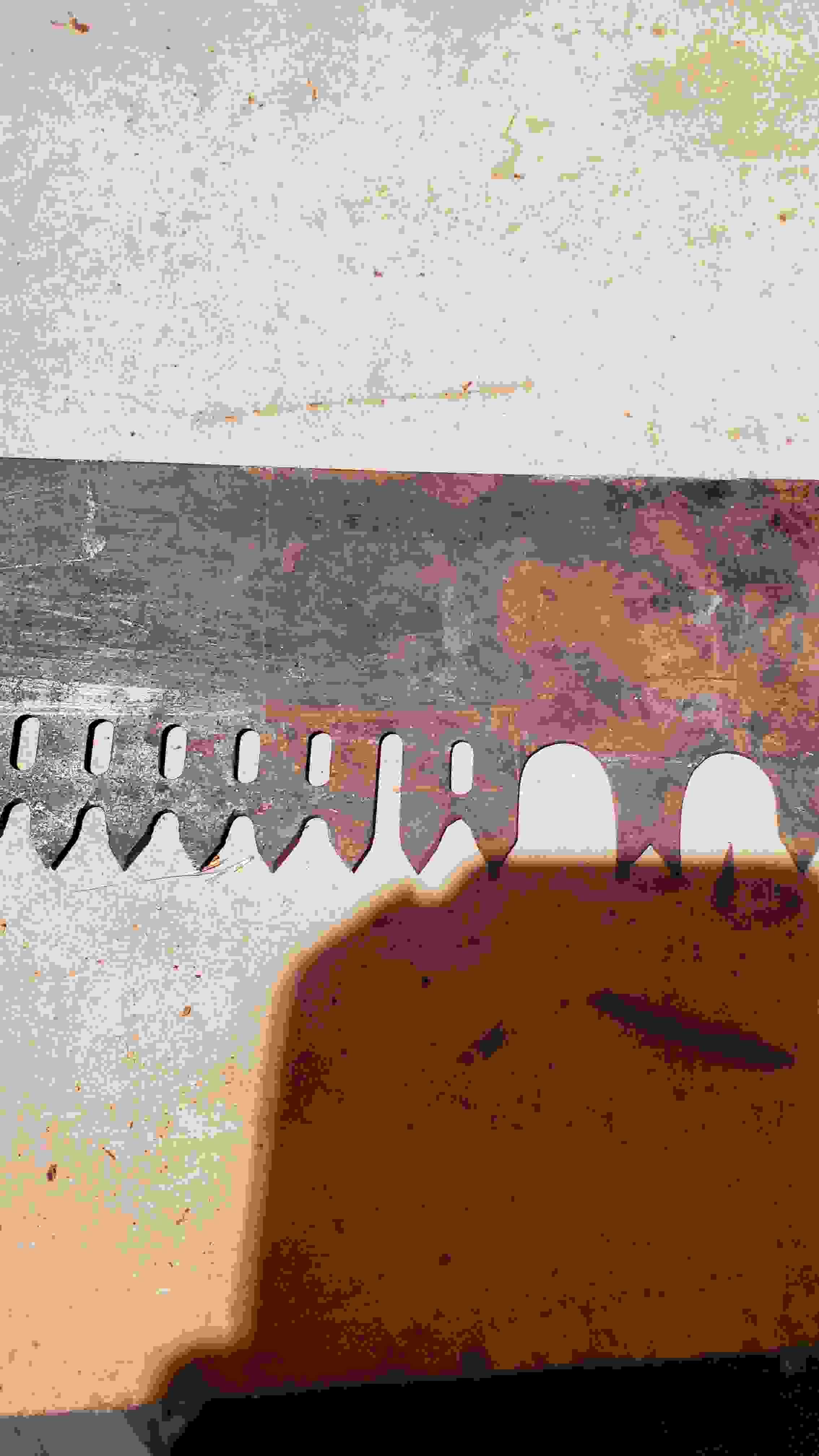 Note: A heavily used and sharpened saw that has had its center teeth filed down from perforated lance to very short perforated lance teeth.