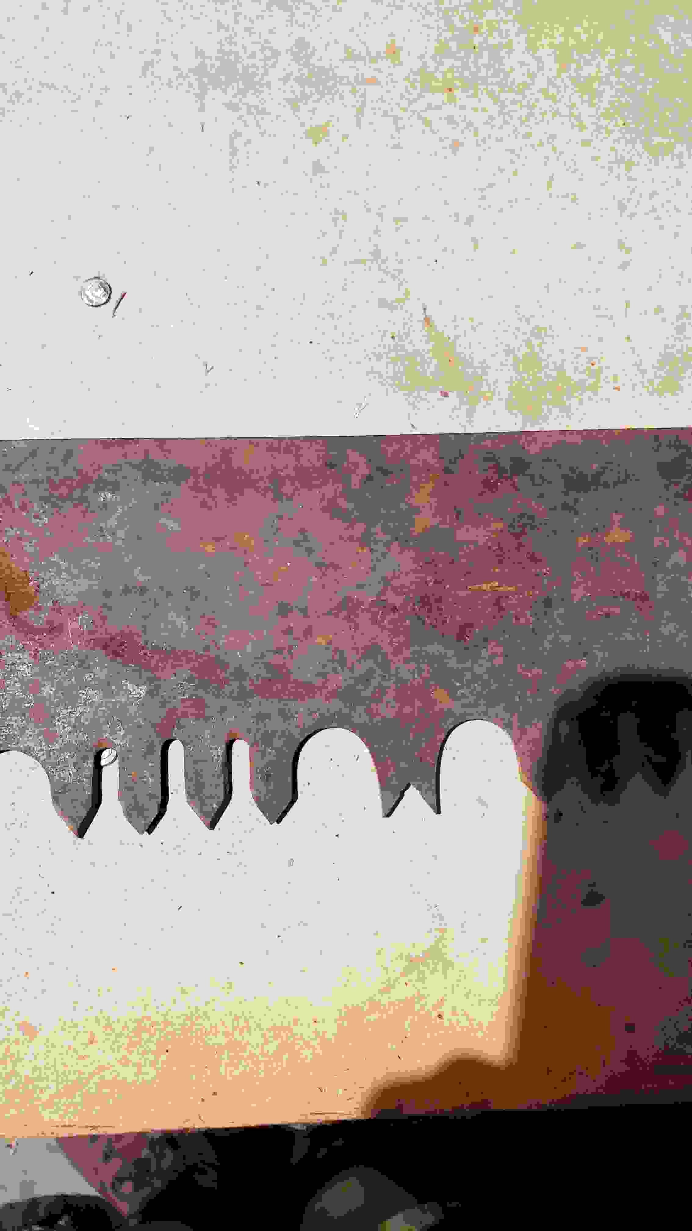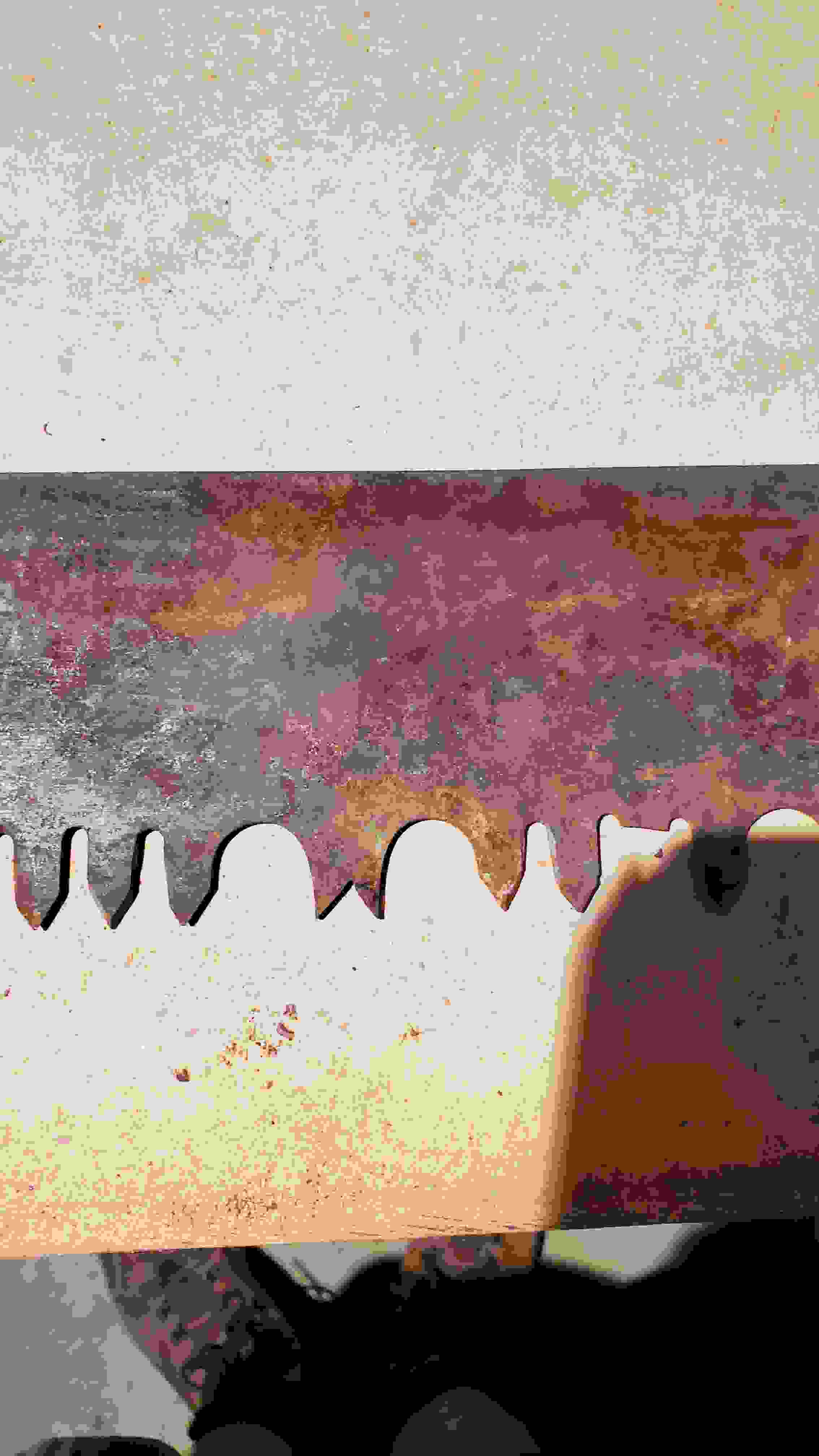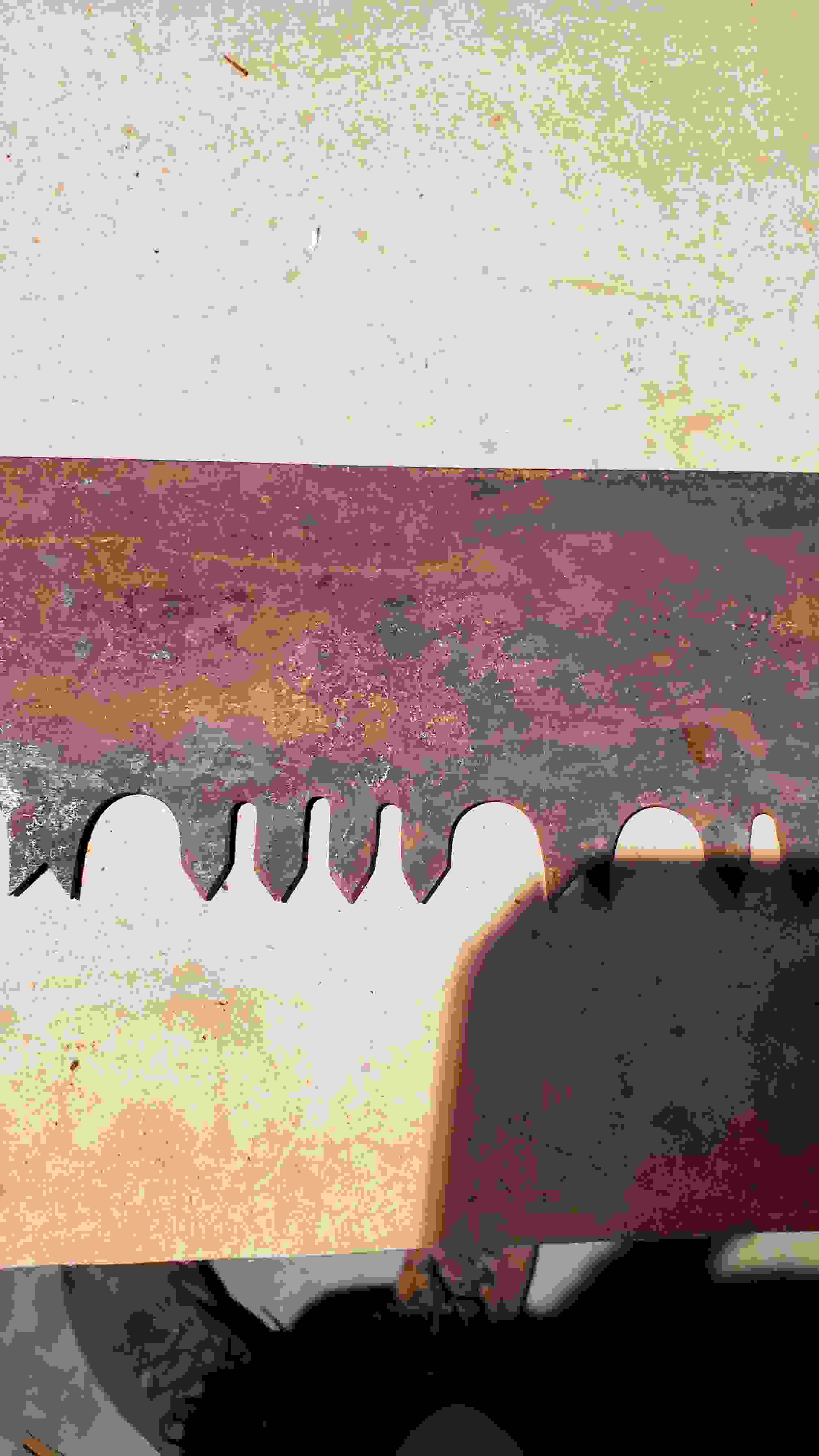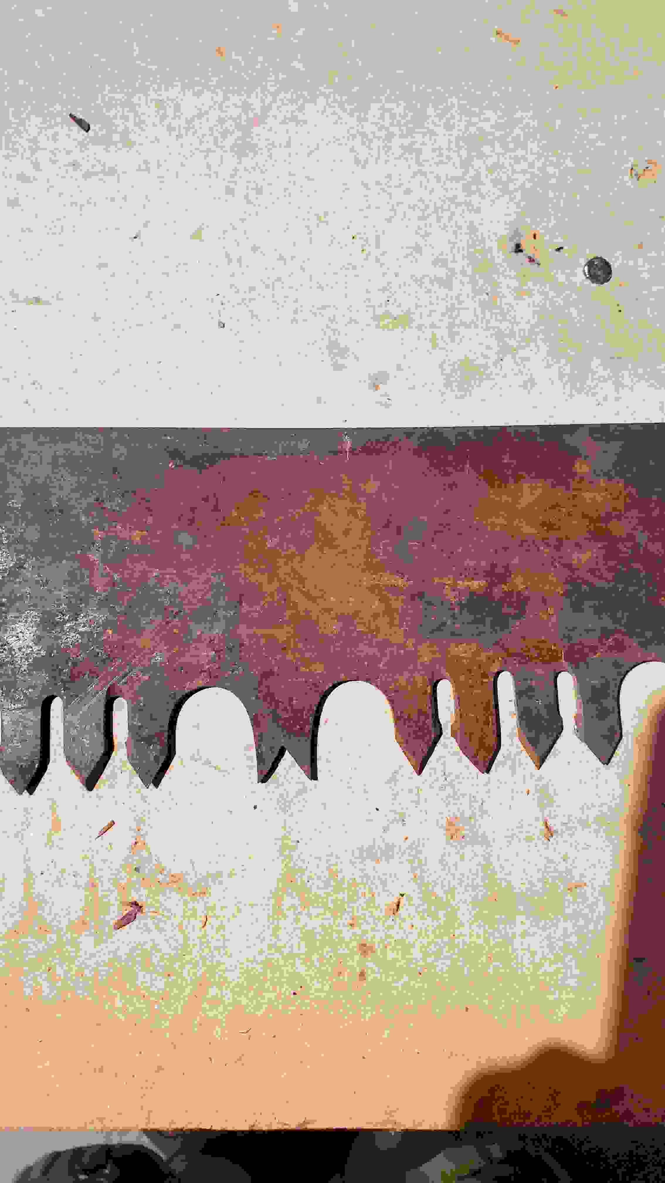 Note: A heavily used and sharpened saw that has had its center teeth filed down from perforated lance to very short perforated lance teeth.